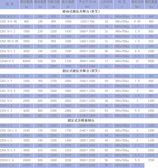 產(chǎn)品特點: 移動式液壓升降臺根據(jù)其載重量、升降范圍、平臺尺寸等參數(shù)的不同配置,組合成上千個不同規(guī)格的產(chǎn)品。 列表所示產(chǎn)品規(guī)格有限,僅供選型參考,具體可視實際使用要求,提出適合自身的訂貨要求。 技術(shù)參數(shù):